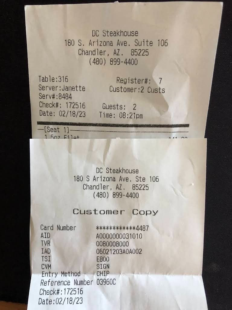Restaurant Receipt & Review Photo Samples – DC Steakhouse